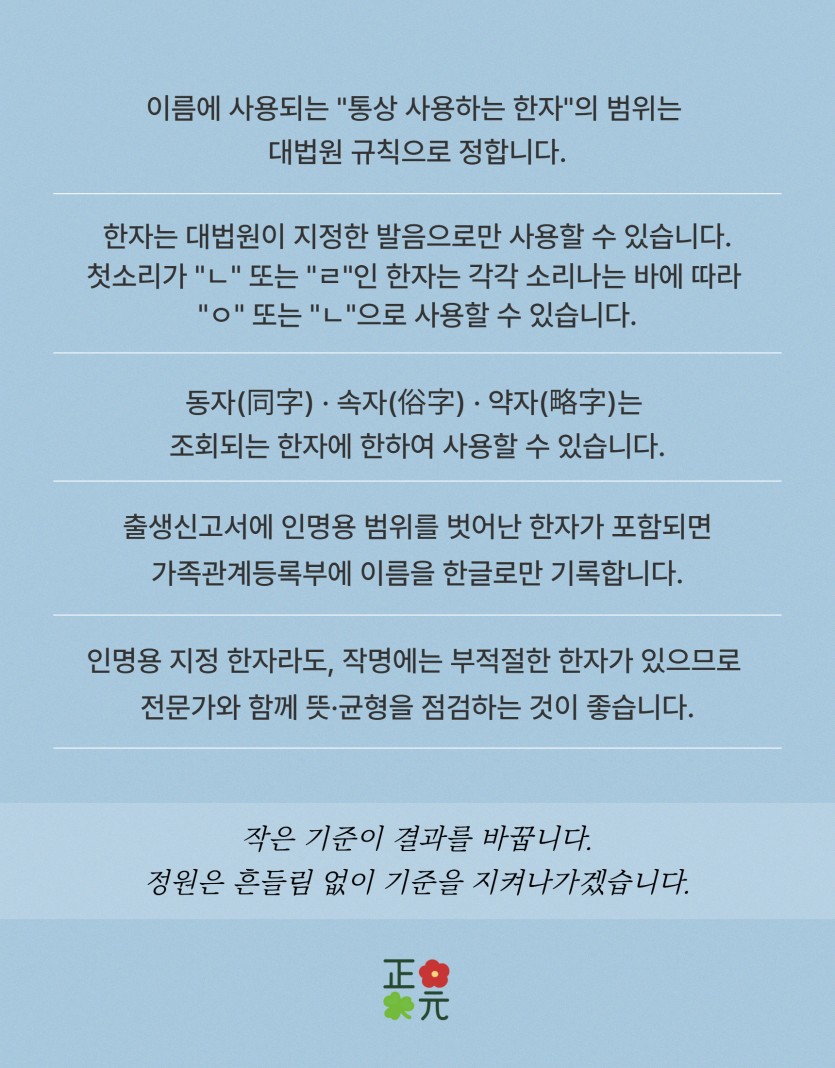 한 글자 한 글자의 기준을 꼼꼼히 확인하여 더 정확한 작명 자료로 상담 및 작명을 진행하겠습니다.